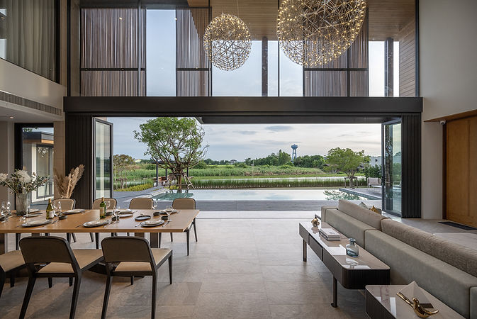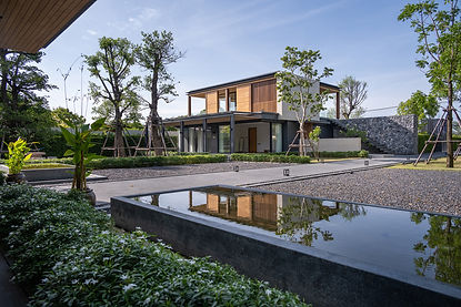 This project began when the homeowner decided to purchase a one-rai plot of land. The land itself is narrow in the front but extends deep toward the back, ending at the Song Phi Nong Canal, where the view opens out to endless rice fields. With this land, the owner wished to create both a retirement home and a family house for his son, who is about to marry and start his own family.