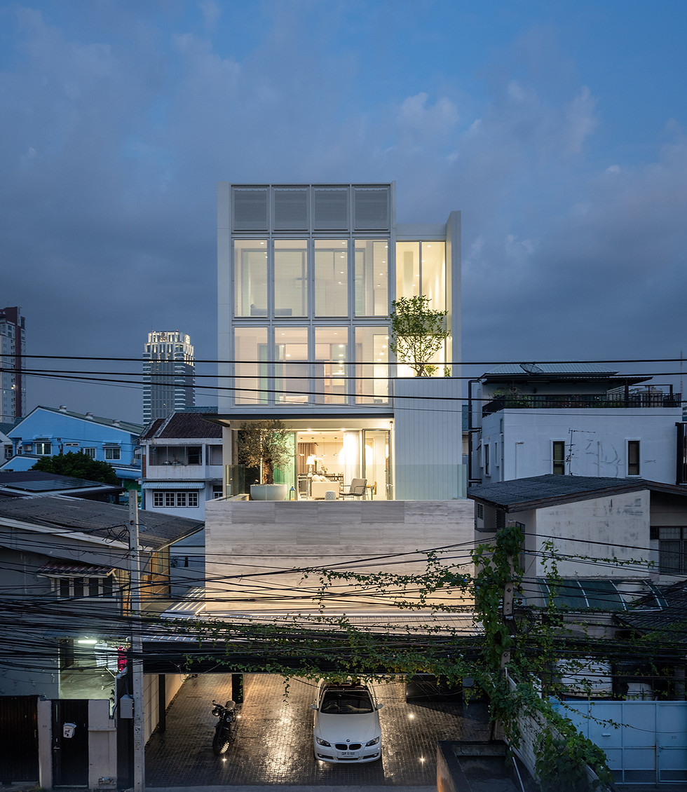 The Inthamara 15 Residence project began with the owner’s vision of building a new residence combined with an office. One of the main requirements was to live close to the family’s original home, leading the owner to acquire a plot of land directly opposite their parents’ house. With land in the city becoming increasingly scarce and expensive, the available site measured only 50 square wah (200 m²), making the project highly challenging. The program was ambitious: parking for at least six cars, an office space for 20–30 staff, a meeting room, a residential zone with living room, dining area, and kitchen connected to one another, a swimming pool for relaxation, and three bedrooms. The first step was to carefully address zoning laws and height restrictions, which play a critical role in a compact urban site. From the site context and client’s needs, the design strategy was shaped into a vertical compact building, with a clear separation of functions by floor: levels 1–2 house the office space, while levels 3–5 accommodate the residence. One of the major design challenges was the swimming pool placed on the 3rd floor, which required meticulous planning in terms of structural design, building systems, and waterproofing. Architecturally, the building massing was strategically recessed and projected to integrate pockets of greenery within the structure. This approach softens the density, creates visual depth, and enhances the play of light and shadow. With the front façade facing west, a perforated screen system was introduced to reduce direct solar gain into the living areas. The material palette emphasizes light tones to give the building a modern yet airy appearance. At levels 1–2, visible from the street, Supergenti Grey stone in white–grey tones was selected to enhance the sense of luxury. At level 3, the first residential floor, Black Maquinna stone was introduced to create contrast and rhythm within the façade. For levels 4–5, painted surfaces were combined with aluminum composite cladding to maintain a sleek and modern finish.